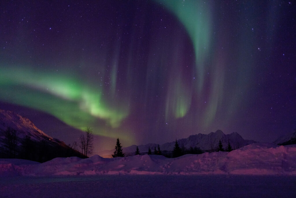 オーロラが現れる瞬間は、とても静かで神聖な時間。最初は薄く帯状に現れ、だんだんと緑や紫の波となって空を舞います。光が踊るたびに、周囲の人たちから思わずため息と拍手が起こることも。寒さの中で見上げる夜空に、自然の力強さと美しさを深く感じるはずです。